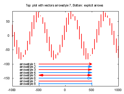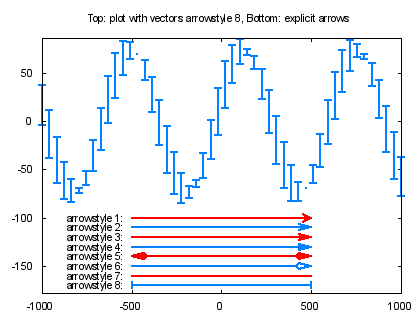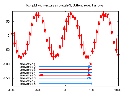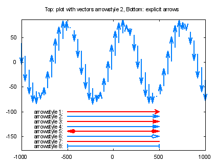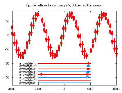 set title 'Top: plot with vectors arrowstyle 8, Bottom: explicit arrows'