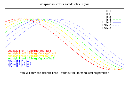 set title "Independent colors and dot/dash styles"