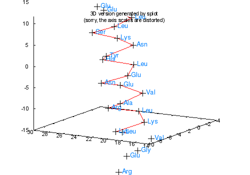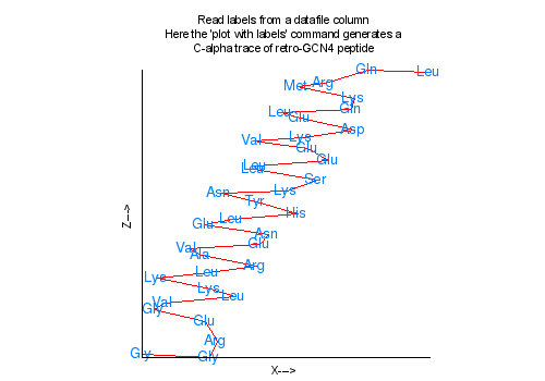 set title "Read labels from a datafile column\nHere the 'plot with labels' command generates a\nC-alpha trace of retro-GCN4 peptide"