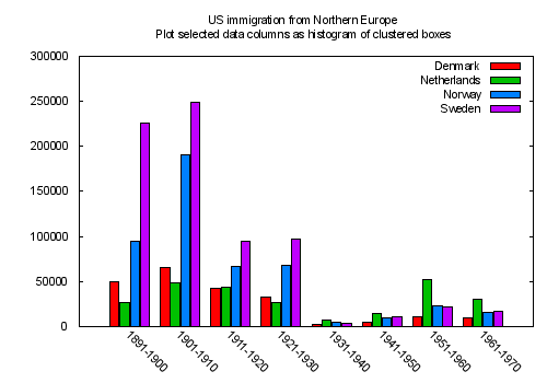 # set title "US immigration from Northern Europe\n(same plot with larger gap between clusters)" set style histogram gap 5 replot #Click here for minimal script to generate this plot