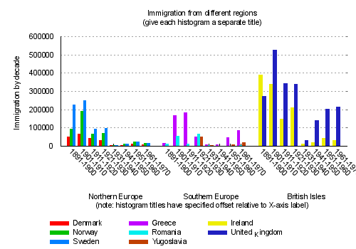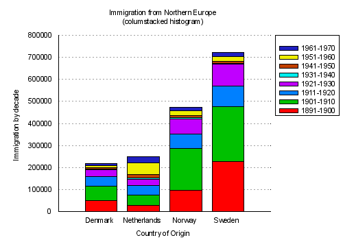 set title "Immigration from Northern Europe\n(columstacked histogram)"