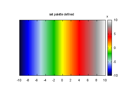 # # $Id: pm3dcolors.dem,v 1.3 2006/03/23 17:53:04 mikulik Exp $ # # Test of new color modes for pm3d palettes. # # Gradient Palettes # set pm3d; set palette set palette color set pm3d map set cbrange [-10:10] set xrange [-10:10] set yrange [*:*] unset ztics unset ytics set samples 101 set isosamples 2 set xtics 2 set palette model RGB set palette defined set title "set palette defined" splot xClick here for minimal script to generate this plot