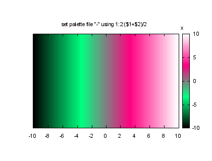set title 'set palette file "-" using 1:2:($1+$2)/2' set palette file "-" using ($0):1:2:(($1+$2)/2) 0 0 0 1 1 0 1 1 e splot xClick here for minimal script to generate this plot