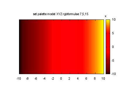 # # Color Models # set palette color set pm3d map set cbrange [-10:10] set xrange [-10:10] unset ztics unset ytics set samples 101 set isosamples 2 set xtics 2 set palette rgbformulae 7,5,15 set palette model RGB rgbformulae 7,5,15 set title "set palette model RGB rgbformulae 7,5,15" splot xClick here for minimal script to generate this plot