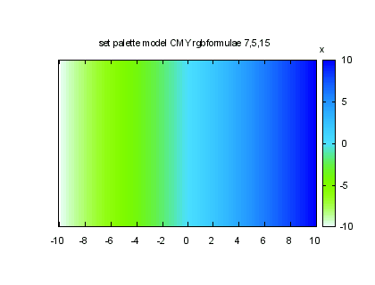 set palette model CMY rgbformulae 7,5,15 set title "set palette model CMY rgbformulae 7,5,15" splot xClick here for minimal script to generate this plot