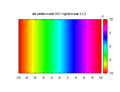 set palette model HSV rgbformulae 3,2,2 set title "set palette model HSV rrgbformulae 3,2,2" splot xClick here for minimal script to generate this plot