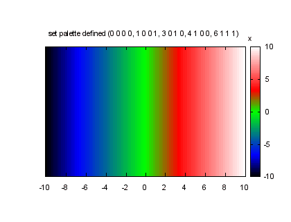 set palette defined (0 0 0 0, 1 0 0 1, 3 0 1 0, 4 1 0 0, 6 1 1 1) set title 'set palette defined (0 0 0 0, 1 0 0 1, 3 0 1 0, 4 1 0 0, 6 1 1 1)' splot xClick here for minimal script to generate this plot