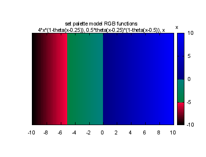 theta(x) = x<0 ? 0 : 1 r(x) = 4*x*(1-theta(x-0.25)) g(x) = 0.5*theta(x-0.25)*(1-theta(x-0.5)) b(x) = x set palette model RGB functions r(gray),g(gray),b(gray) set title "set palette model RGB functions\n4*x*(1-theta(x-0.25)), 0.5*theta(x-0.25)*(1-theta(x-0.5)), x" splot xClick here for minimal script to generate this plot
