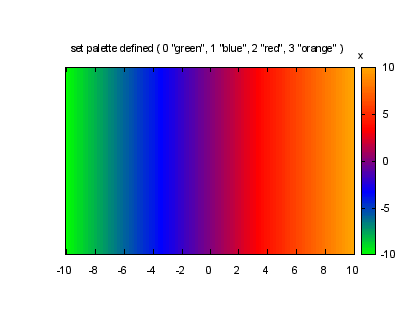 set palette defined ( 0 "green", 1 "blue", 2 "red", 3 "orange" ) set title 'set palette defined ( 0 "green", 1 "blue", 2 "red", 3 "orange" )' splot xClick here for minimal script to generate this plot