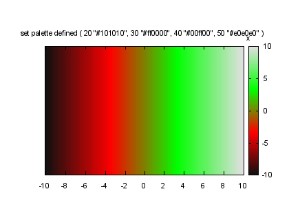 set palette defined ( 20 "#101010", 30 "#ff0000", 40 "#00ff00", 50 "#e0e0e0" ) set title 'set palette defined ( 20 "#101010", 30 "#ff0000", 40 "#00ff00", 50 "#e0e0e0" )' splot xClick here for minimal script to generate this plot