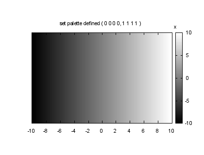# # User Defined Functions # set palette color set pm3d map set cbrange [-10:10] set xrange [-10:10] set yrange [0:1] unset ztics unset ytics set samples 101 set isosamples 2 set xtics 2 set palette model RGB set palette functions gray, gray, gray set title "set palette functions gray, gray, gray" splot xClick here for minimal script to generate this plot
