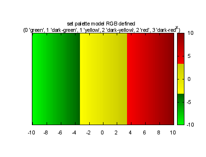 set palette model RGB set palette model RGB defined (0 "green", 1 "dark-green", 1 "yellow", 2 "dark-yellow", 2 "red", 3 "dark-red" ) set title "set palette model RGB defined\n(0 'green', 1 'dark-green', 1 'yellow', 2 'dark-yellow', 2 'red', 3 'dark-red' )" splot xClick here for minimal script to generate this plot