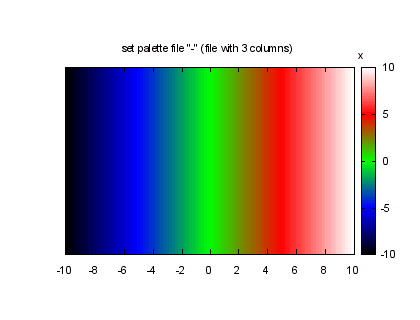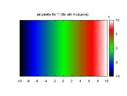 set title 'set palette file "-" (file with 4 columns)' set palette file "-" 10 0 0 0 20 0 0 1 40 0 1 0 60 1 0 0 70 1 1 1 e splot xClick here for minimal script to generate this plot