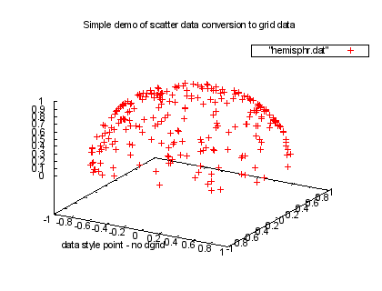 # # $Id: scatter.dem,v 1.7 2003/10/28 05:35:54 sfeam Exp $ # # Simple demo of scatter data conversion to grid data. # set title "Simple demo of scatter data conversion to grid data" unset hidden3d set ticslevel 0.5 set view 60,30 set autoscale set parametric set style data points set xlabel "data style point - no dgrid" set key box splot "hemisphr.dat"Click here for minimal script to generate this plot