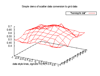 set dgrid3d 10,10,1 set xlabel " data style lines, dgrid3d 10,10,1" set style data lines splot "hemisphr.dat"Click here for minimal script to generate this plot