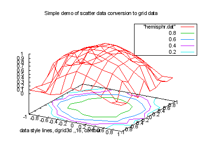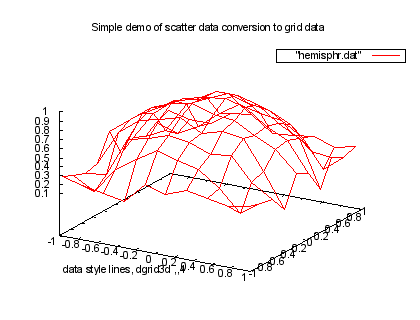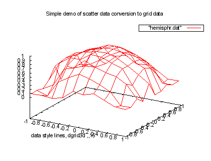 set dgrid3d ,,16 set xlabel " data style lines, dgrid3d ,,16" set style data lines splot "hemisphr.dat"Click here for minimal script to generate this plot