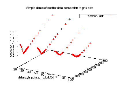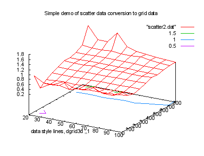 set key nobox set dgrid3d ,,1 set xlabel "data style lines, dgrid3d ,,1" set style data lines splot "scatter2.dat"Click here for minimal script to generate this plot
