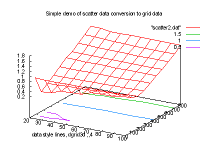 set dgrid3d ,,4 set xlabel "data style lines, dgrid3d ,,4" set style data lines splot "scatter2.dat"Click here for minimal script to generate this plot