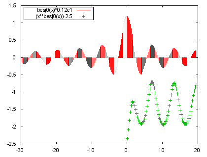 plot [-30:20] besj0(x)*0.12e1 with impulses, (x**besj0(x))-2.5 with pointsClick here for minimal script to generate this plot