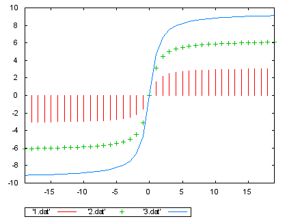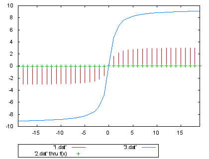 f(x) = x/100 plot [-19:19] '1.dat'with impulses ,'2.dat' thru f(x) ,'3.dat' with linesClick here for minimal script to generate this plot