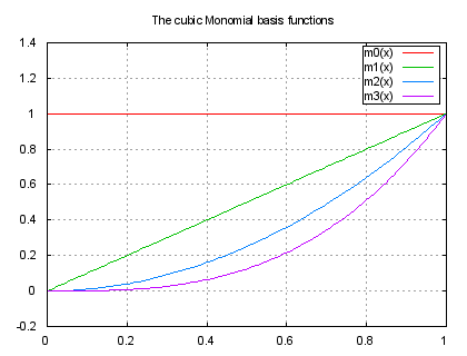 # # $Id: spline.dem,v 1.6 2004/09/28 06:06:10 sfeam Exp $ # # Some curve plotting using common cubic polynomial basis function for cagd. # # Gershon Elber, Aug. 1992 # set xrang [0:1] set grid set key box set yrange[-0.2:1.4] m0(x) = 1 m1(x) = x m2(x) = x**2 m3(x) = x**3 set title "The cubic Monomial basis functions" plot m0(x), m1(x), m2(x), m3(x)Click here for minimal script to generate this plot