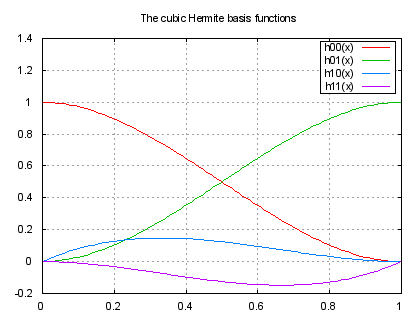 h00(x) = x**2 * ( 2 * x - 3) + 1 h01(x) = -x**2 * (2 * x - 3) h10(x) = x * (x - 1)**2 h11(x) = x**2 * (x - 1) set title "The cubic Hermite basis functions" plot h00(x), h01(x), h10(x), h11(x)Click here for minimal script to generate this plot