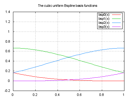 bsp0(x) = ( 1 - 3 * x + 3 * x**2 - x**3 ) / 6; bsp1(x) = ( 4 - 6 * x**2 + 3 * x**3 ) / 6; bsp2(x) = ( 1 + 3 * x + 3 * x**2 - 3 * x**3 ) / 6 bsp3(x) = x**3 / 6 set title "The cubic uniform Bspline basis functions" plot bsp0(x), bsp1(x), bsp2(x), bsp3(x)Click here for minimal script to generate this plot