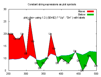 title 'plot <foo> using 1:2:( ($3>$2) ? "Up" : "Dn" ) with labels'