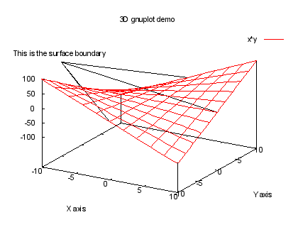 # # $Id: surface1.dem,v 1.11 2004/09/17 05:01:12 sfeam Exp $ # set samples 21 set isosample 11 set xlabel "X axis" offset -3,-2 set ylabel "Y axis" offset 3,-2 set zlabel "Z axis" offset -5 set title "3D gnuplot demo" set label 1 "This is the surface boundary" at -10,-5,150 center set arrow 1 from -10,-5,120 to -10,0,0 nohead set arrow 2 from -10,-5,120 to 10,0,0 nohead set arrow 3 from -10,-5,120 to 0,10,0 nohead set arrow 4 from -10,-5,120 to 0,-10,0 nohead set xrange [-10:10] set yrange [-10:10] splot x*yClick here for minimal script to generate this plot