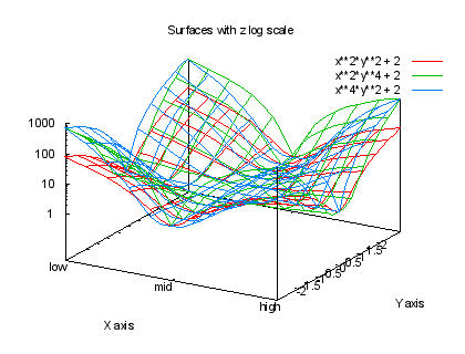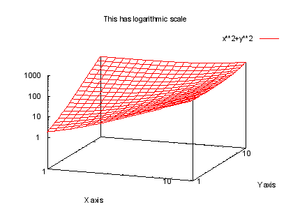 unset hidden3d; unset parametric; set isosamples 20,20 set xrange [-1:1]; set yrange [-1:1] set ztics autofreq unset arrow unset label set log set auto set title "This has logarithmic scale" splot [x=1:15] [y=1:15] x**2+y**2Click here for minimal script to generate this plot