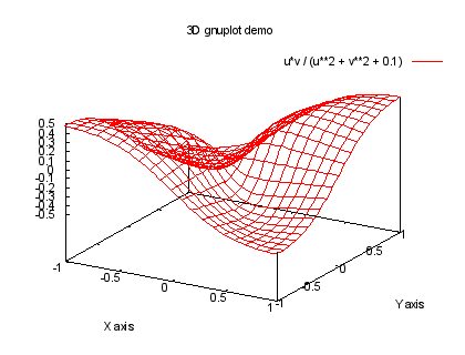 unset log z set xtics autofreq set ytics autofreq set xrange [-1:1] set yrange [-1:1] set samples 51 set isosample 21 set dummy u,v set title "3D gnuplot demo" splot u*v / (u**2 + v**2 + 0.1)Click here for minimal script to generate this plot