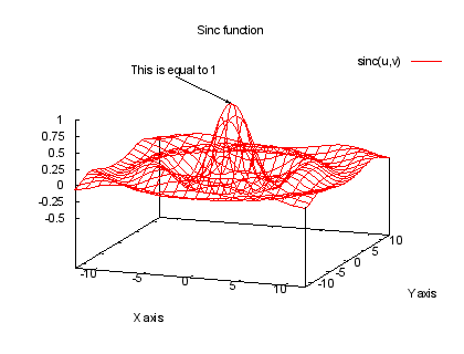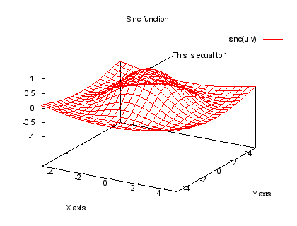 set title "Sinc function" set zrange [-1:1] set label 1 "This is equal to 1" at 0,3.2,1 left set arrow 1 from 0,3,1 to 0,0,1 sinc(u,v) = sin(sqrt(u**2+v**2)) / sqrt(u**2+v**2) splot [-5:5.01] [-5:5.01] sinc(u,v)Click here for minimal script to generate this plot