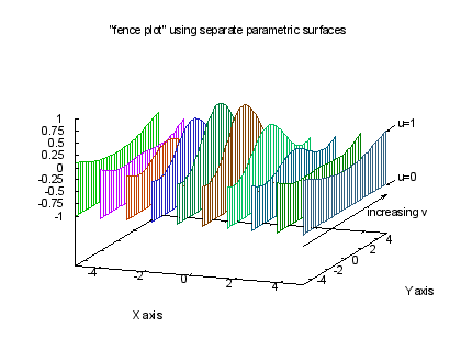 set title "\"fence plot\" using separate parametric surfaces" # A method suggested by Hans-Bernhard Broeker # <broeker@physik.rwth-aachen.de>: display a separate parametric # surface for each fence. set zrange [-1:1] unset label unset arrow set xrange [-5:5]; set yrange [-5:5] set arrow from 5,-5,-1.2 to 5,5,-1.2 lt -1 set label 1 "increasing v" at 6,0,-1 set arrow from 5,6,-1 to 5,5,-1 lt -1 set label 2 "u=0" at 5,6.5,-1 set arrow from 5,6,sinc(5,5) to 5,5,sinc(5,5) lt -1 set label 3 "u=1" at 5,6.5,sinc(5,5) set parametric set hidden3d set isosamples 2,33 xx=-5; dx=(4.99-(-4.99))/9 x0=xx; xx=xx+dx x1=xx; xx=xx+dx x2=xx; xx=xx+dx x3=xx; xx=xx+dx x4=xx; xx=xx+dx x5=xx; xx=xx+dx x6=xx; xx=xx+dx x7=xx; xx=xx+dx x8=xx; xx=xx+dx x9=xx; xx=xx+dx splot [u=0:1][v=-4.99:4.99] \ x0, v, (u<0.5) ? -1 : sinc(x0,v) notitle, \ x1, v, (u<0.5) ? -1 : sinc(x1,v) notitle, \ x2, v, (u<0.5) ? -1 : sinc(x2,v) notitle, \ x3, v, (u<0.5) ? -1 : sinc(x3,v) notitle, \ x4, v, (u<0.5) ? -1 : sinc(x4,v) notitle, \ x5, v, (u<0.5) ? -1 : sinc(x5,v) notitle, \ x6, v, (u<0.5) ? -1 : sinc(x6,v) notitle, \ x7, v, (u<0.5) ? -1 : sinc(x7,v) notitle, \ x8, v, (u<0.5) ? -1 : sinc(x8,v) notitle, \ x9, v, (u<0.5) ? -1 : sinc(x9,v) notitleClick here for minimal script to generate this plot