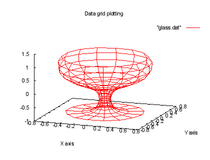 unset log set xrange [0:15] set yrange [0:15] set auto #set zrange [-0.6:0.7] set ticslevel 0 set style data lines set title "Data grid plotting" set parametric splot "glass.dat"Click here for minimal script to generate this plot
