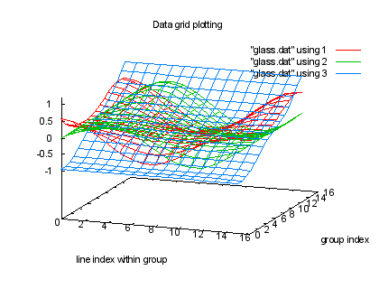 set zrange [-1.2:1.2] set ticslevel 0.5 unset parametric set xlabel "line index within group" set ylabel "group index" splot "glass.dat" using 1, "glass.dat" using 2, "glass.dat" using 3Click here for minimal script to generate this plot