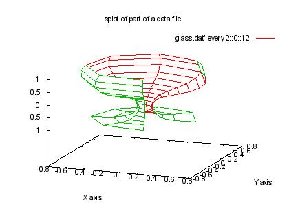 set title "splot of part of a data file" set xlabel "X axis" offset -3,-2 set ylabel "Y axis" offset 3,-2 set hidden3d splot 'glass.dat' every 2::0::12 with linesClick here for minimal script to generate this plot