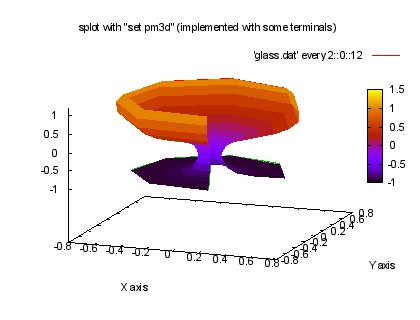 set title "splot with \"set pm3d\" (implemented with some terminals)" set pm3d set hidden3d splot 'glass.dat' every 2::0::12 with linesClick here for minimal script to generate this plot