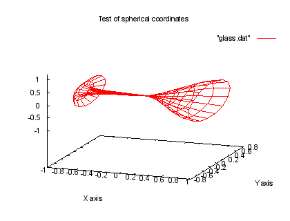 unset hidden3d unset pm3d set param set title "Test of spherical coordinates" set mapping spherical splot "glass.dat"Click here for minimal script to generate this plot