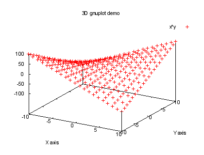 set title "3D gnuplot demo" unset grid splot x*y with pointsClick here for minimal script to generate this plot