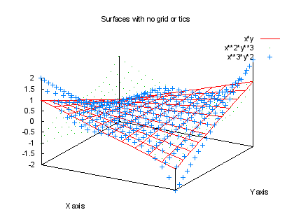 unset xtics unset ytics set xrange [-1:1] set yrange [-1:1] set title "Surfaces with no grid or tics" splot x*y with lines, x**2*y**3 with dots, x**3*y*2 with pointsClick here for minimal script to generate this plot